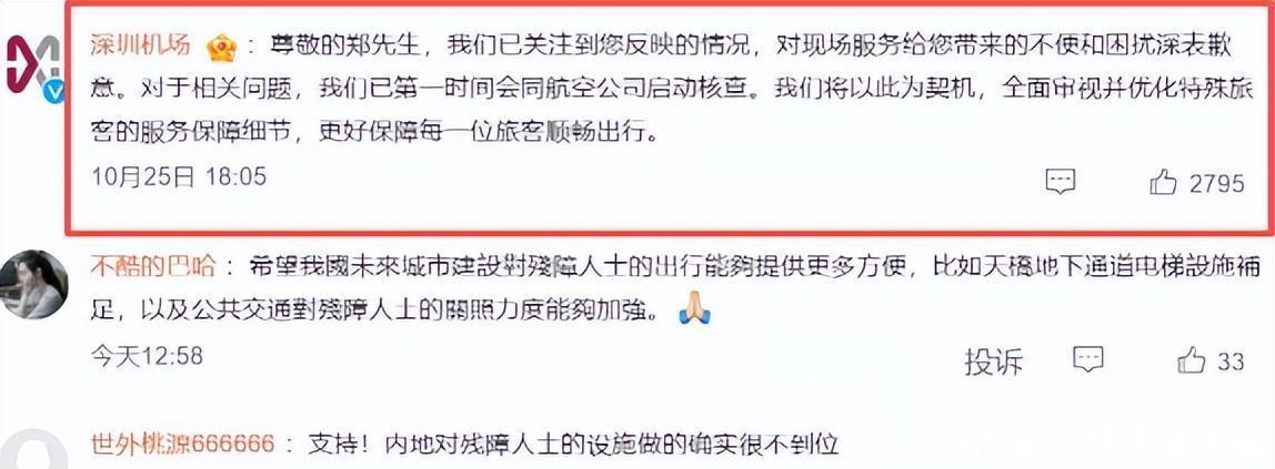 本来现在的人都比较同情人泛滥,尤其是对一些弱势群体来讲,大家的情绪就更高了。所以网上的人都觉得这机场服务太差,对一个残疾人怎么能这样,好多人跑去机场的官方账号底下留言,话说得都挺难听,还有人喊着要抵制。深圳机场这边看到后反应也快,赶紧出来道歉,说这事是他们没做好以后一定改。