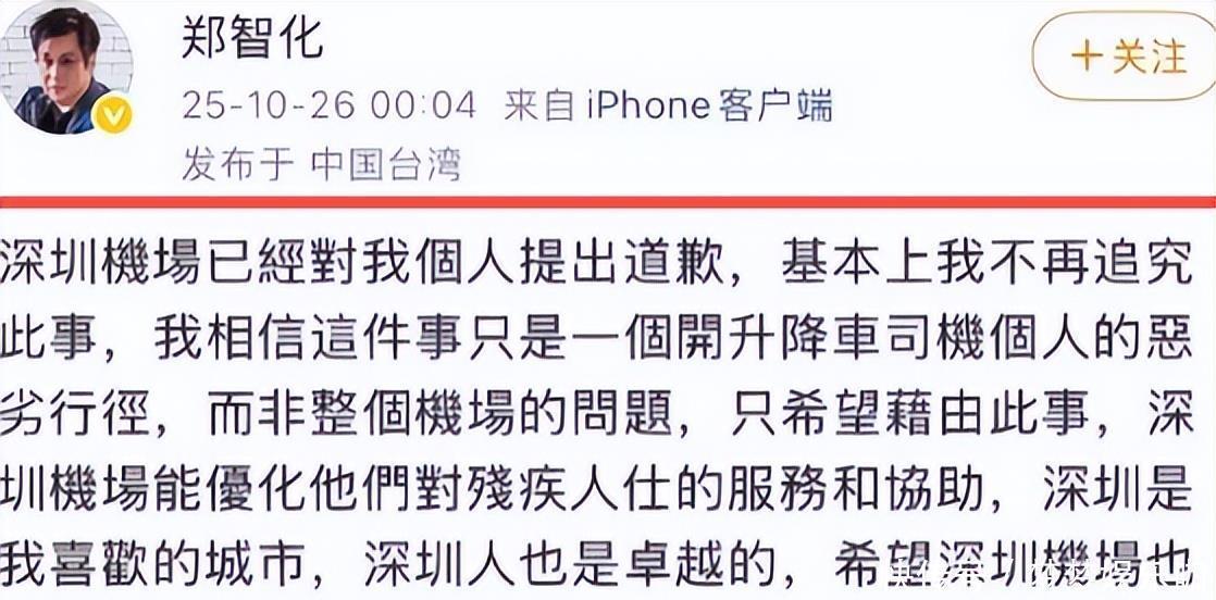 [免责声明]文章的时间、过程、图片均来自于网络,文章旨在传播正能量,均无低俗等不良引导,请观众勿对号入座,并上升到人身攻击等方面。观众理性看待本事件,切勿留下主观臆断的恶意评论,互联网不是法外之地。本文如若真实性存在争议、事件版权或图片侵权问题,请及时联系作者,我们将予以删除。信息来源:郑智化回应深圳机场道歉,不再追究.大象新闻红星新闻深圳机场深夜致歉,郑智化回应郑智化再发文:我常在大陆演出,深圳机场遭遇不是偶发事件.观察者网郑智化就“连滚带爬”表述致歉.凤凰网#郑智化就用词不当道歉#.Vista看天下