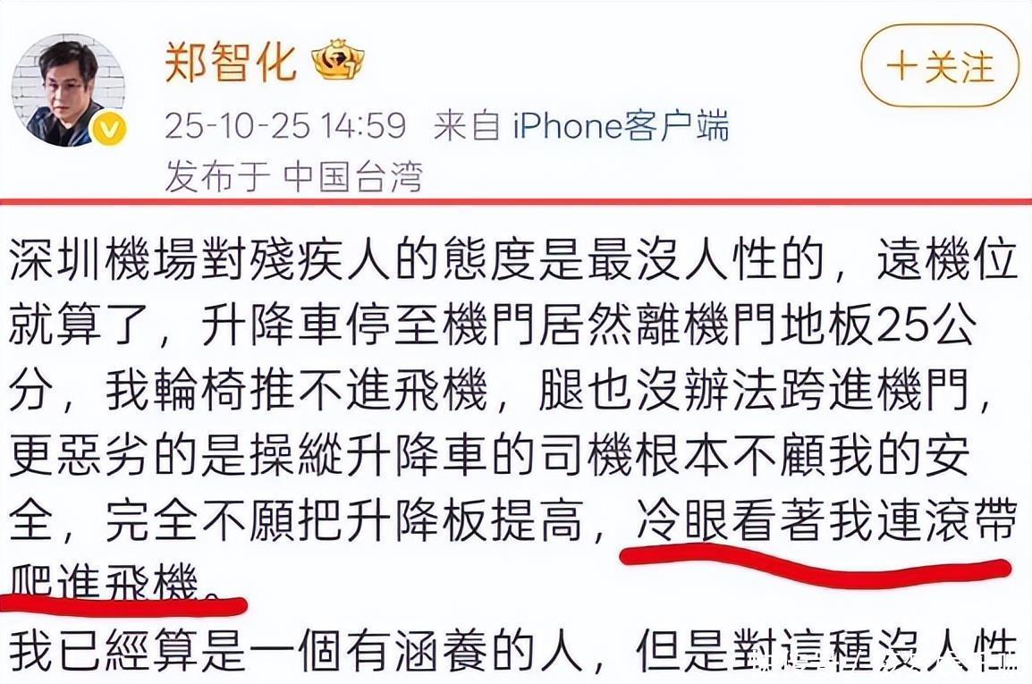 事实证明,这次将矛头对准整个大陆机场的郑智化,已经不再被网友们“宽容”了......事件开始10月25号,郑智化在网上把他自己在深圳机场的经历给说了出来,他说升降车和飞机舱门中间,空出来很大一道缝,差不多有25公分,他的轮椅根本就过不去。意思就是管升降车的人就不搭理他,不愿意把车再凑近点,就睁着大眼睛看着他自己费劲巴拉地往飞机上挪。